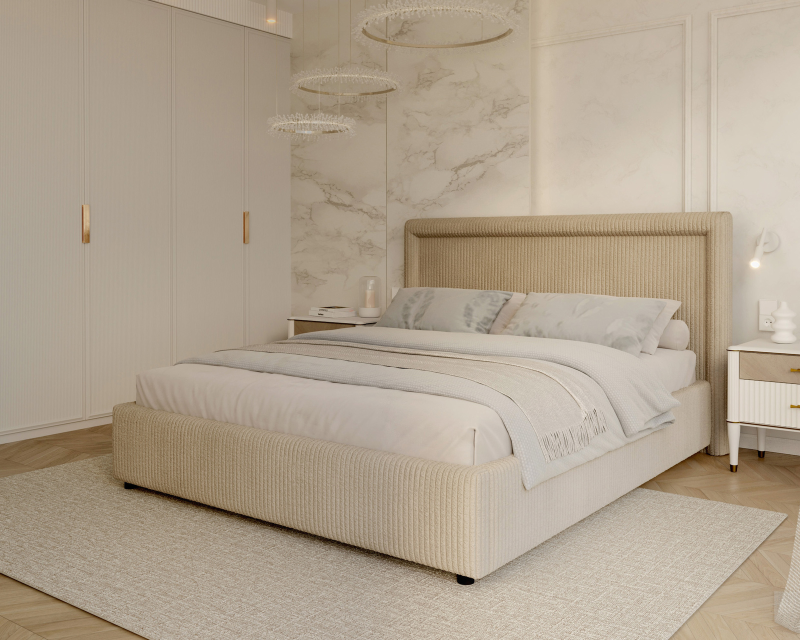 Łóżko tapicerowane NOBILE to idealne połączenie elegancji i funkcjonalności, które doskonale wpisuje się w nowoczesne wnętrza. Wykonane z sztruksu o delikatnym, beżowym odci