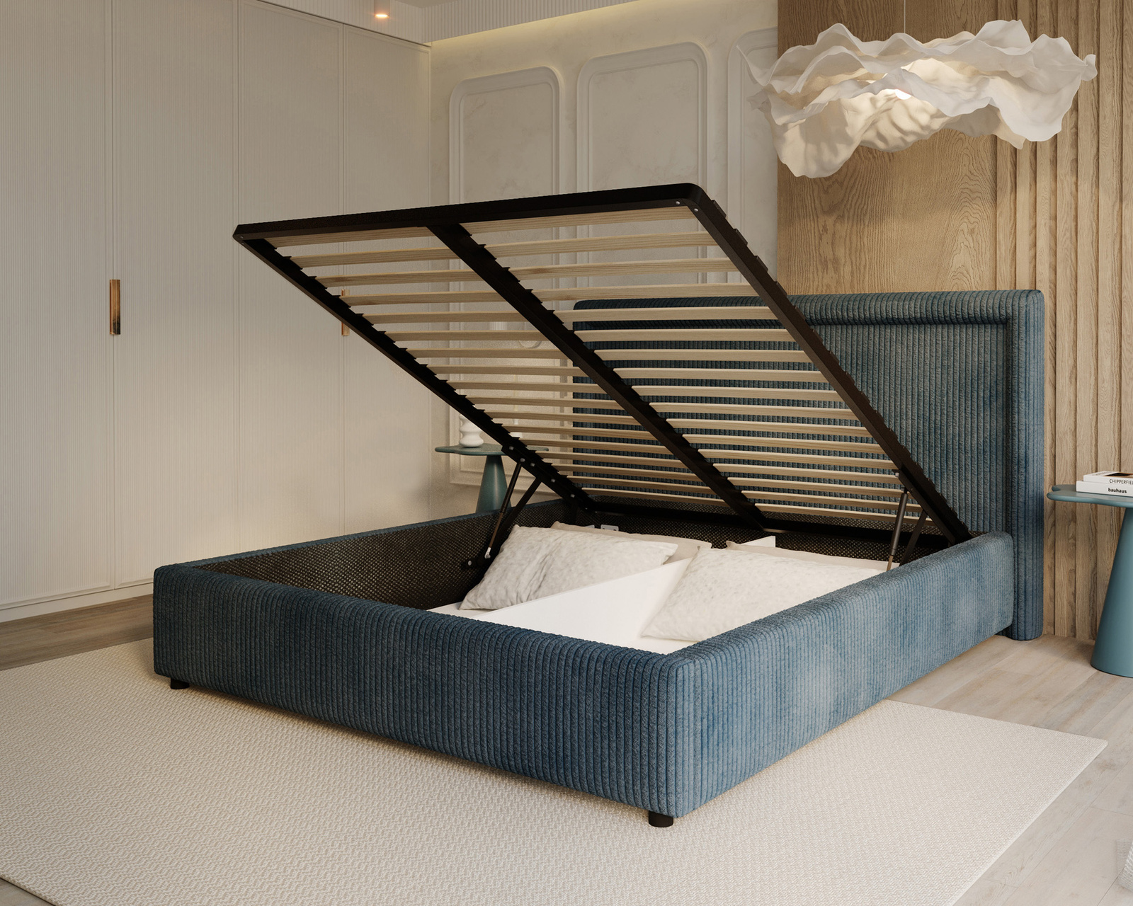 ✅Konstrukcja łóżka opiera się na solidnym metalowym stelażu z mechanizmem podnoszącym, co umożliwia łatwy dostęp do pojemnika na pościel, oferując jednocześnie dodatkową przestrzeń do przechowywania.